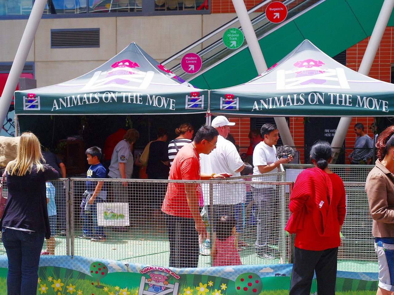 移動動物園(Animanls on the move)。最初、ここにきたとき、係員が準備中で、中(フェンスの向こう)に入れなかった。用意ができた時、「どうぞお入りください」と言ったけど、子供は、ビビッて誰も入らない。すかさず、ケイが一番乗り。もちろん、大人も楽しんでいいのです。