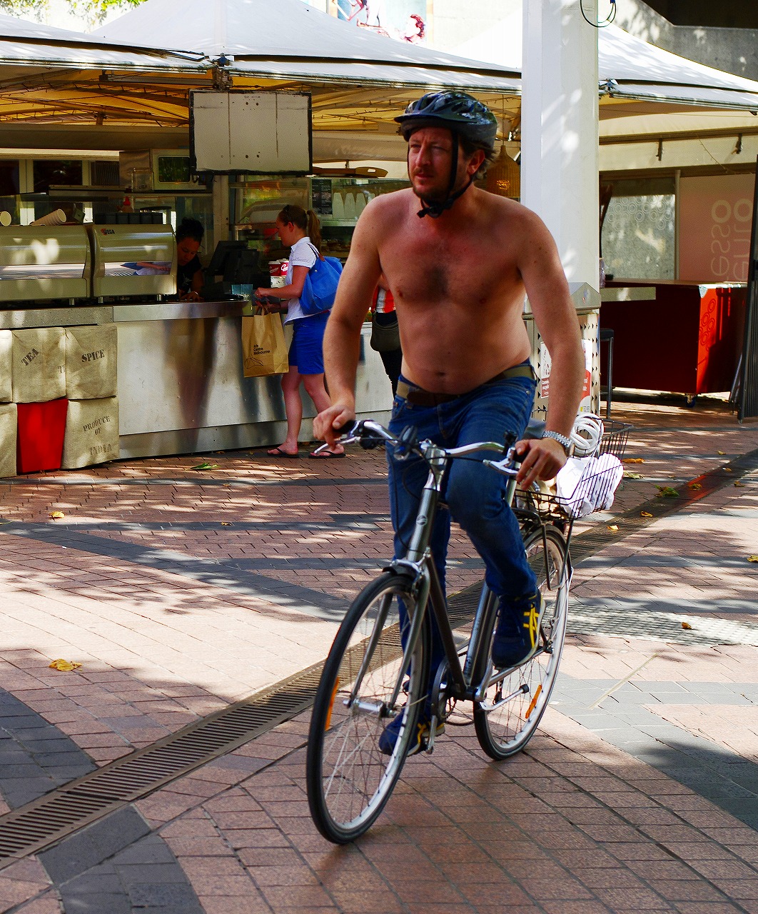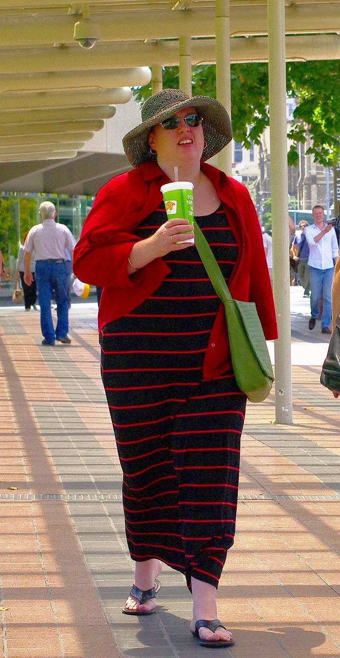 豊かな女性が登場です。いいですね。横縞は太って見えるのに、横縞を着る。この女性の場合、なにを着ても太って見えるというより、事実、太っている。太っているのを魅力にしている。太っているんだから糖分摂取しなくてもいいのに、歩きながらも摂取する。