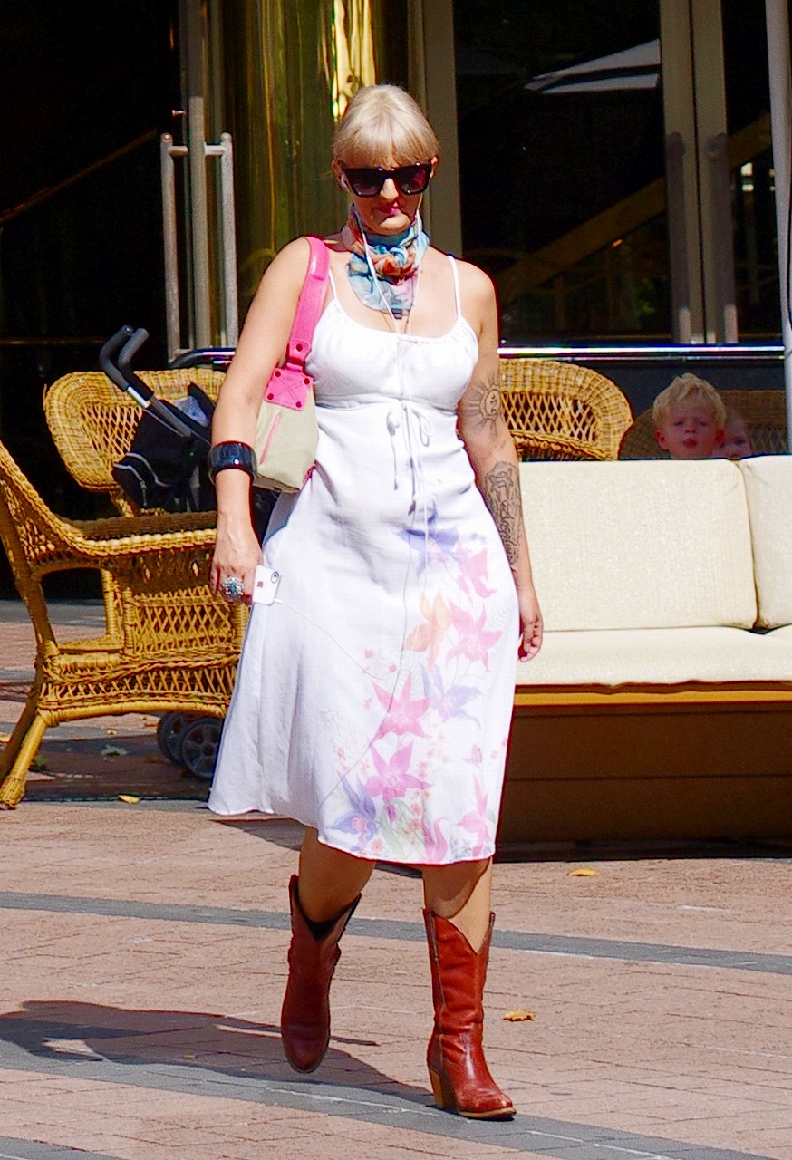 ムム、裸ではありませんが白のドレスを着た女性が公然と路上に! これは芸術ではありません。動きます。右腕のリング、左腕の刺青、ユニークです。