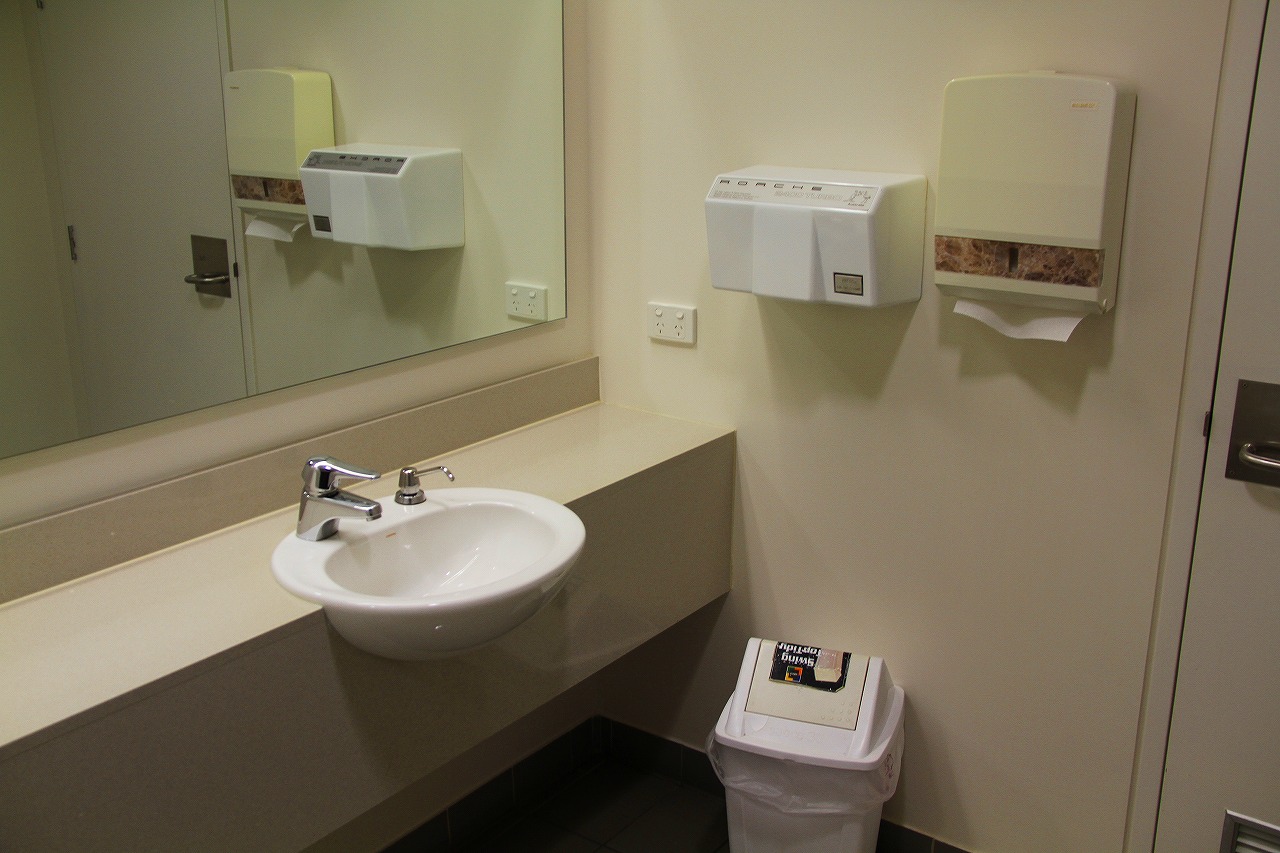 洗面台も現代的です。温風乾燥機と紙タオルが併設されていました。