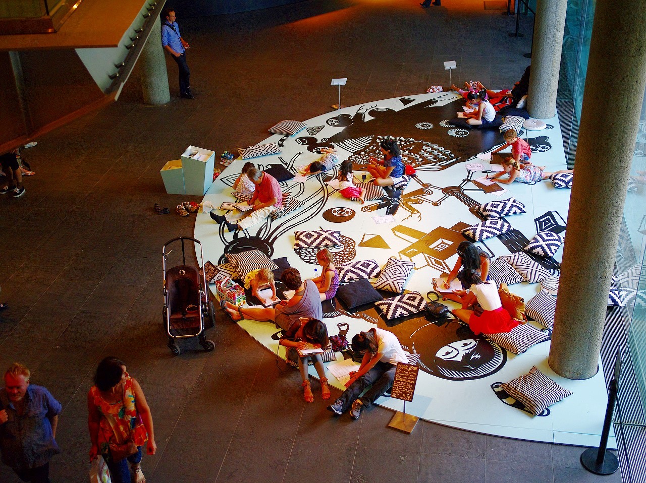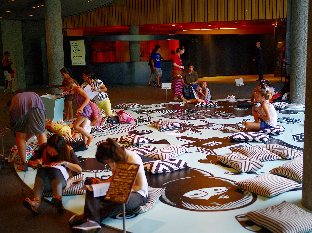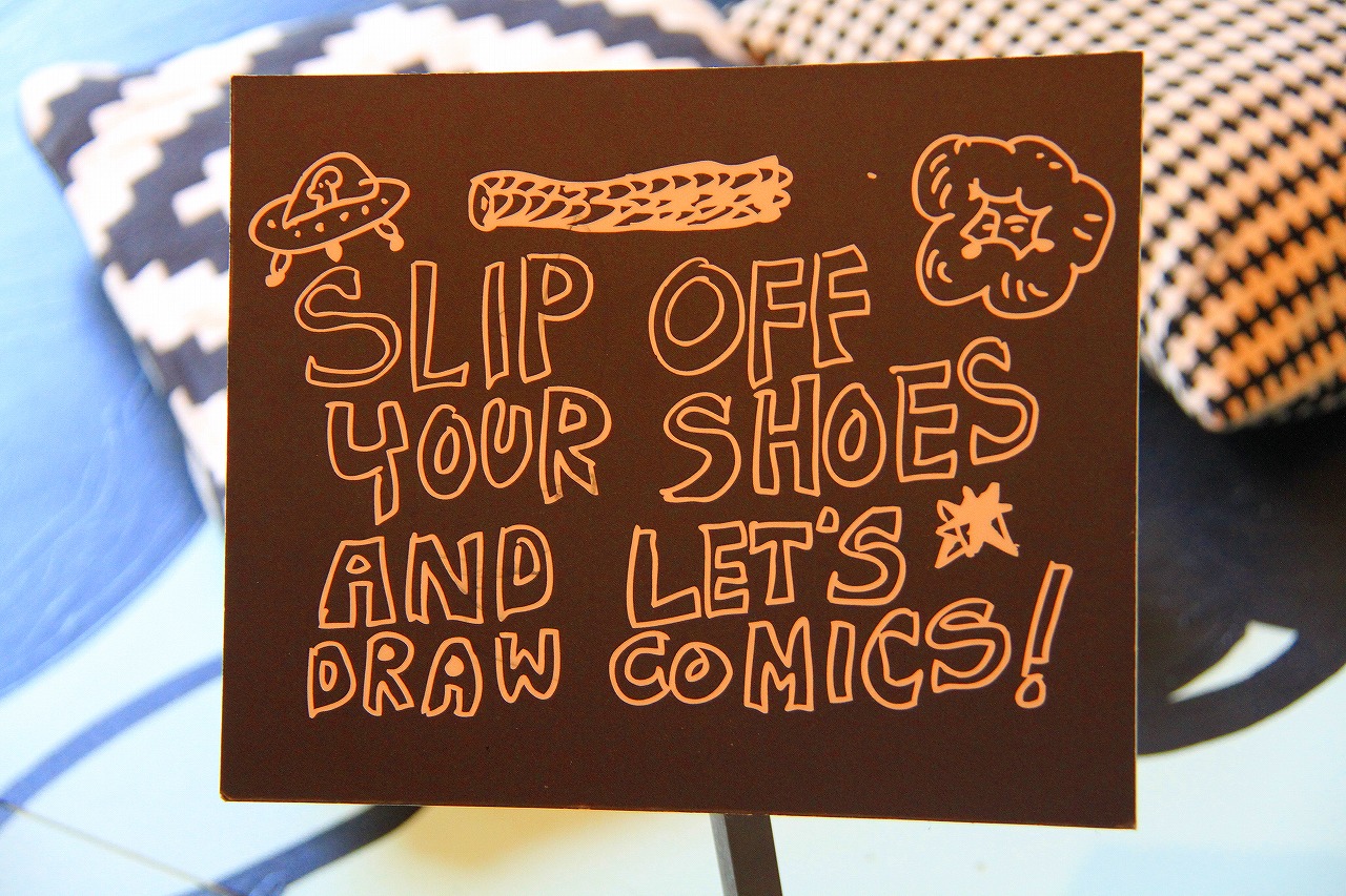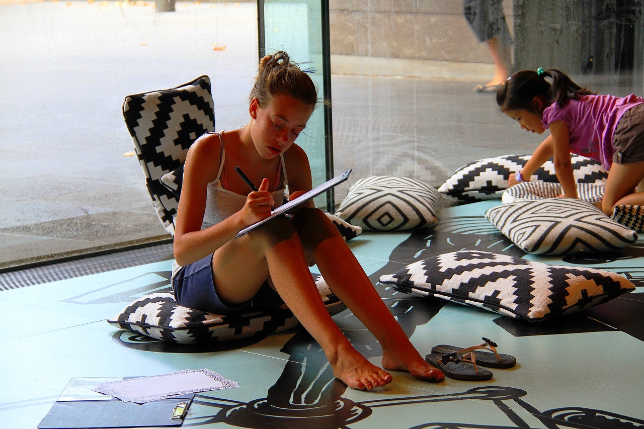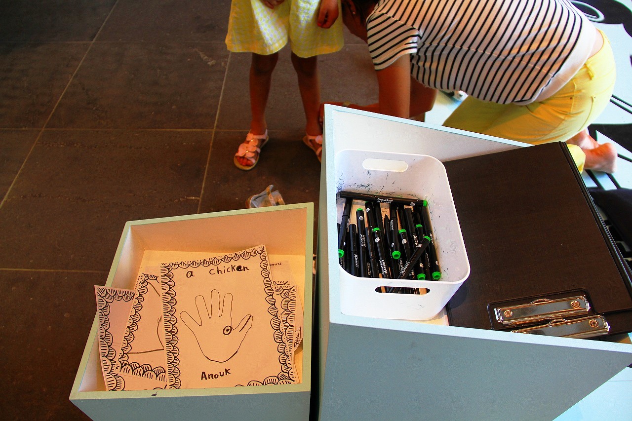 G階(日本の1階)のに入口左にある半円形のカラフルなスペースは、最初、寝そべり休憩スペースかと思いました。実は、「マンガお絵かきゾーン(Comic zone)」です。「靴を脱いで、座って、お絵かきしましょう。描いた作品を展示するので、残しておいてね!」 と書いてあります。