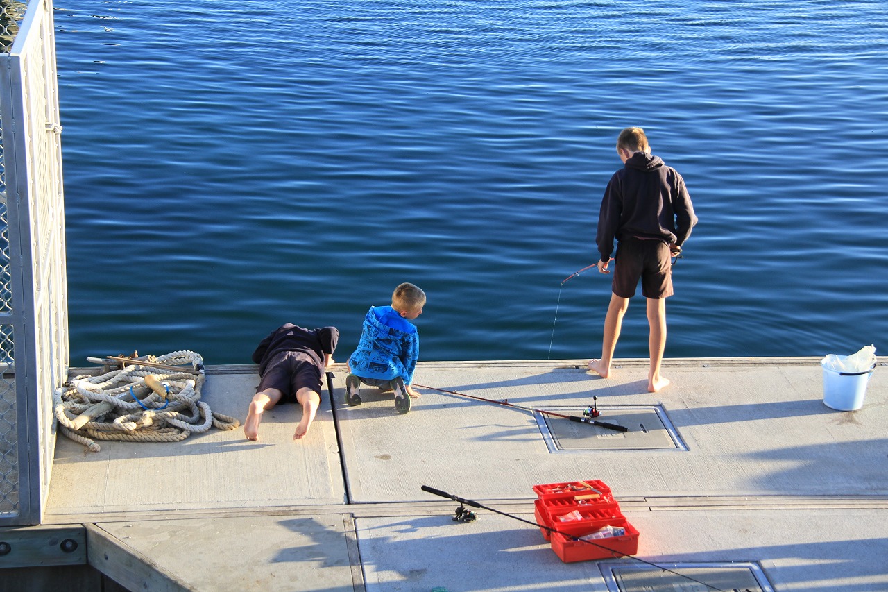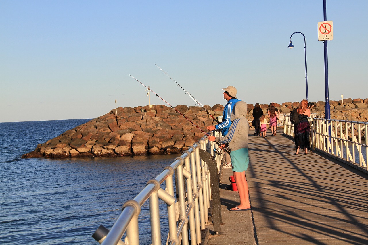 大人も釣りをする。とその時、おじさん、釣りました。大魚でしょうか?