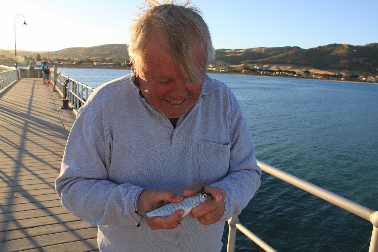 「釣った魚の写真を撮らせて」とお願いした。一応、魚を広げて見せてくれたが、とても恥ずかしそうで、顔をあげてくれない。写真を撮ると、「こんな小魚は釣りたくない」と、魚を海に放り込んだ。魚の長さは20cmほどあると思うが、不満なんですね。