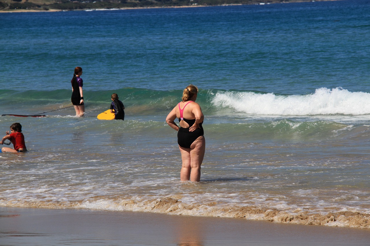 眼下のビーチ。ビキニのお嬢さんがいました。美しいですね。美しさが、チョッと、違いました?