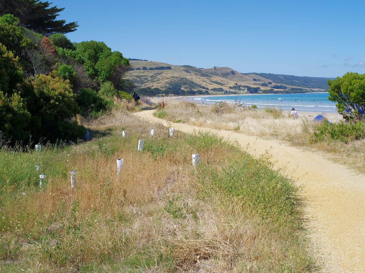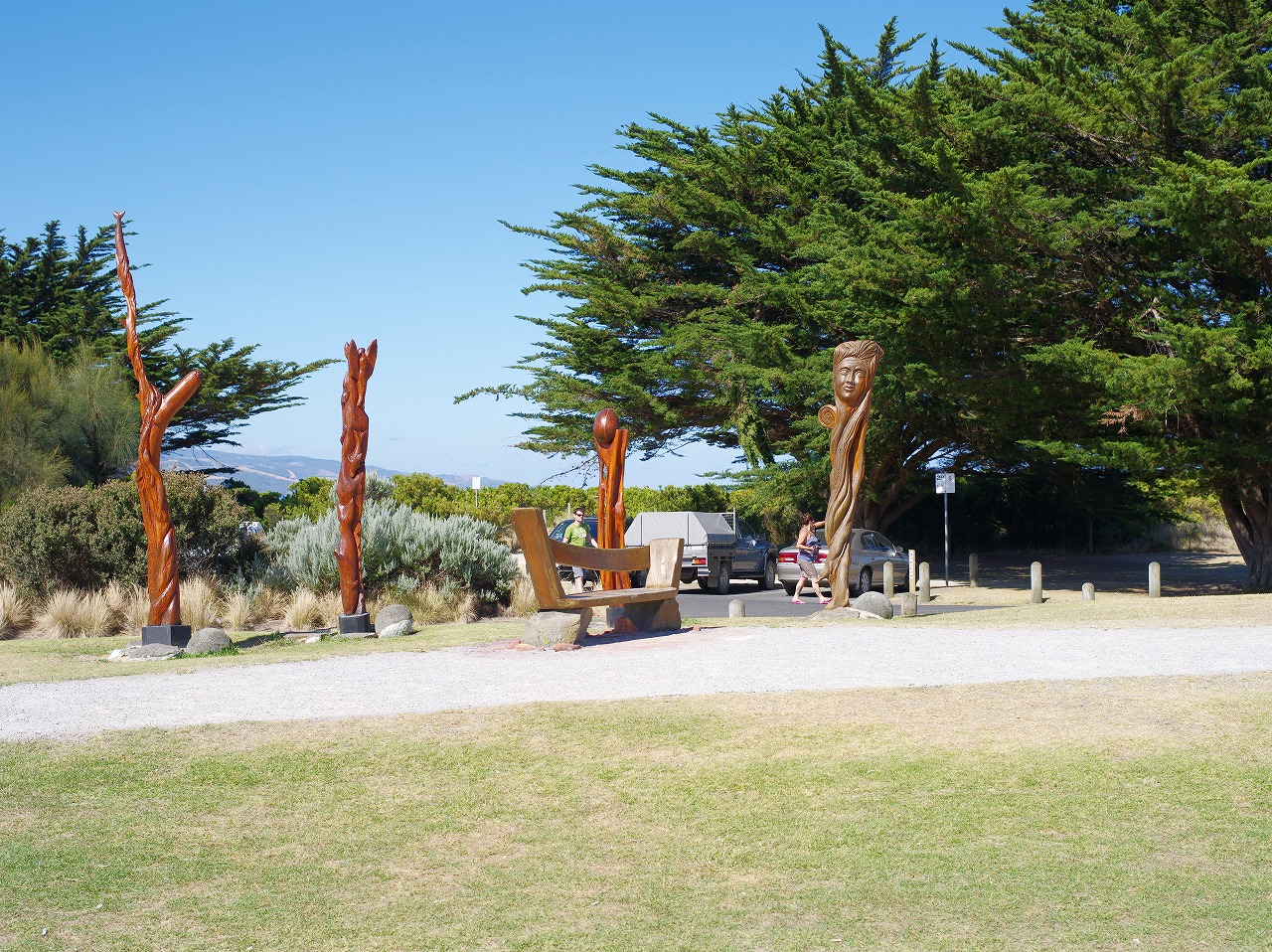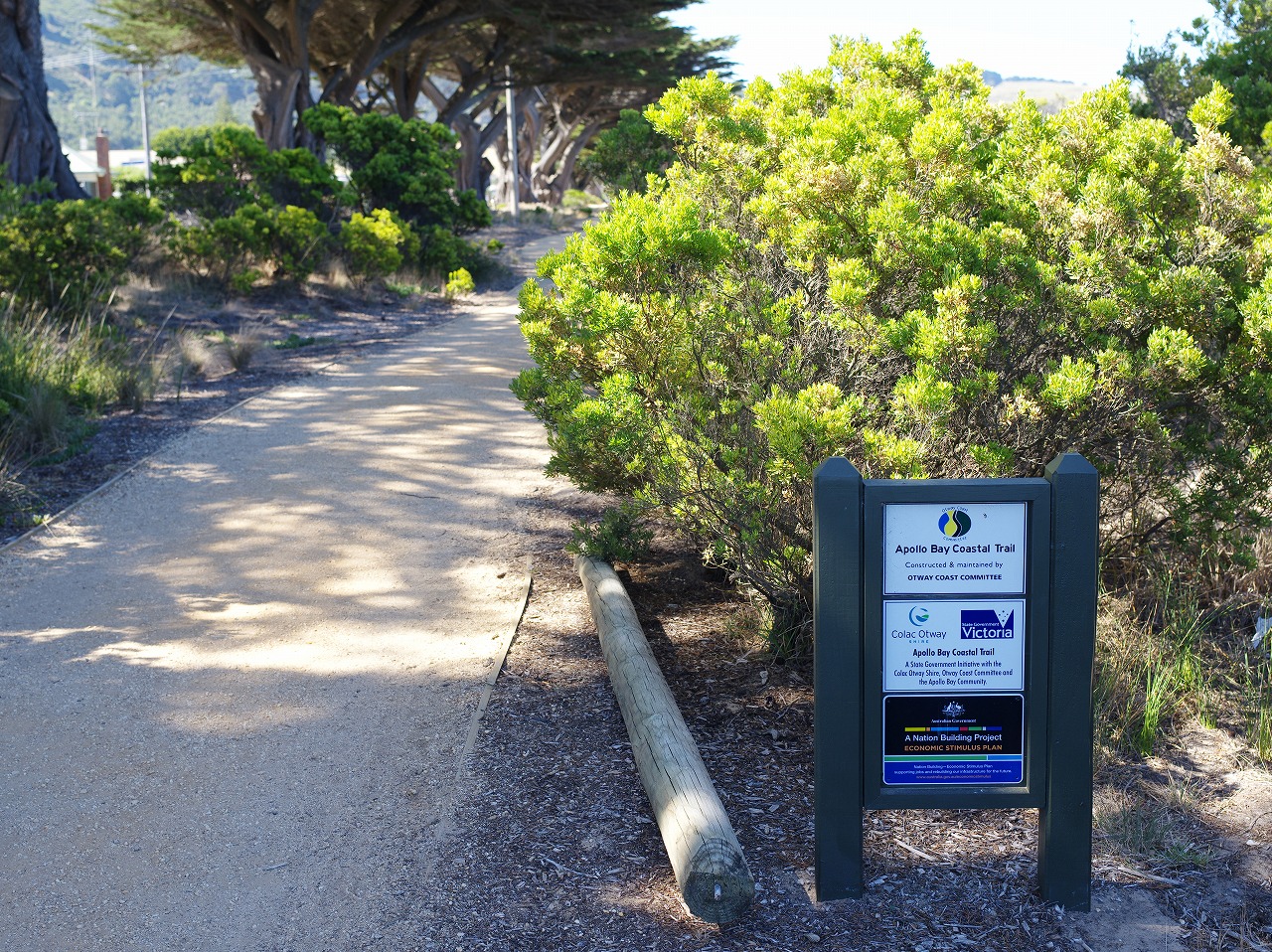 ビーチのかなり北まで歩いたので、砂浜から道路側に上がり、折り返し、ビーチ沿いの歩道を戻ってくることにした。後で撮った写真ですが、アポロベイ岸辺トレイル(Apollo Bay Costal Trail)とある。向こう(北)から、こちら(南)に戻ってきました。