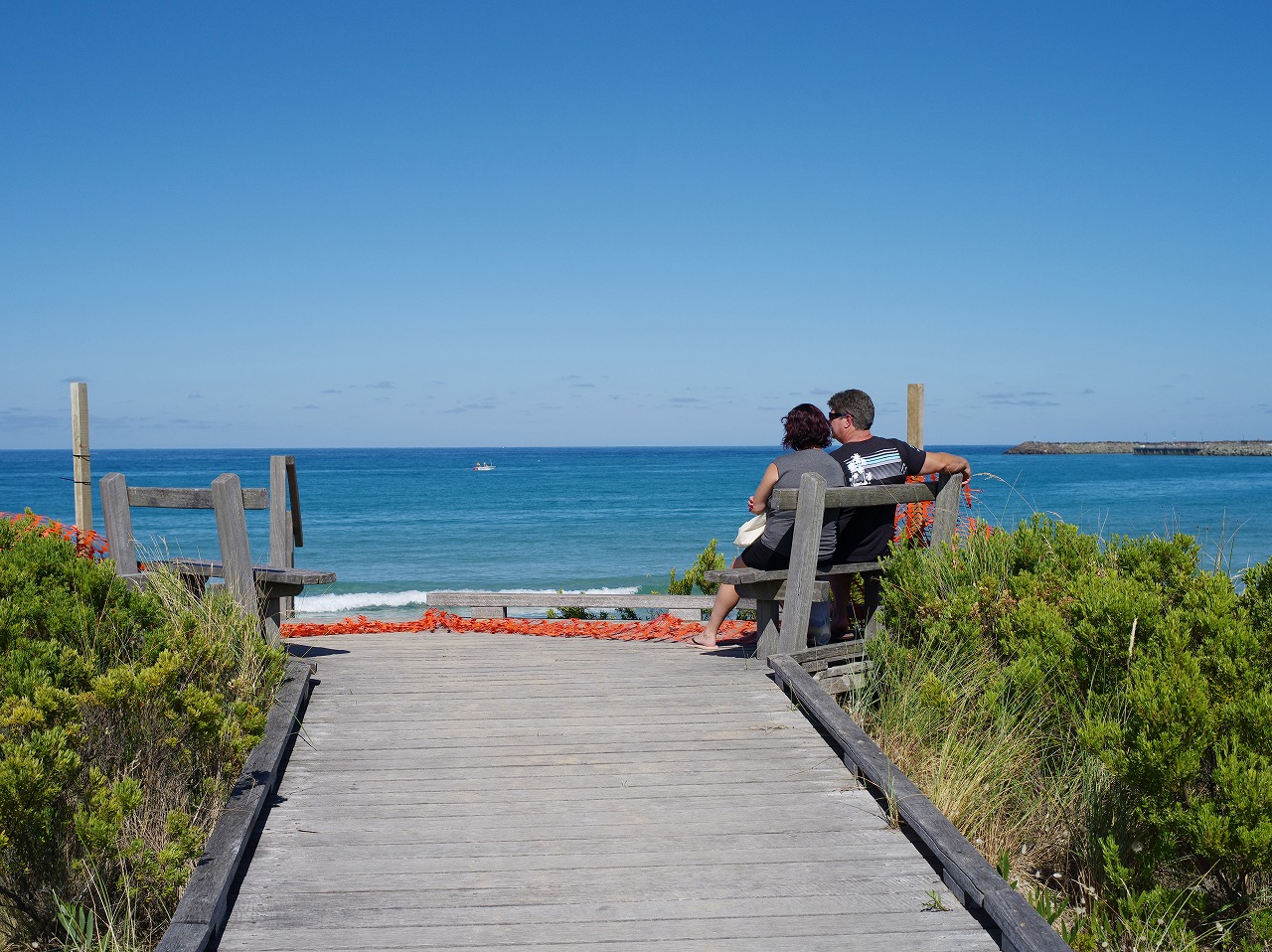 トレイルをさらに歩く。ところどころ木道があり、ビーチを眺める展望台がある。カップルが椅子に腰かけ、ビーチを眺めている。