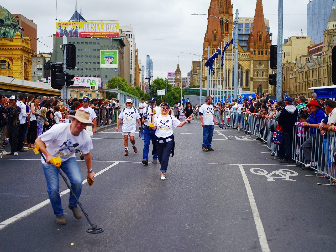 パレードに戻る。金属探知機を持って行進する男性。そこには落ちてません!