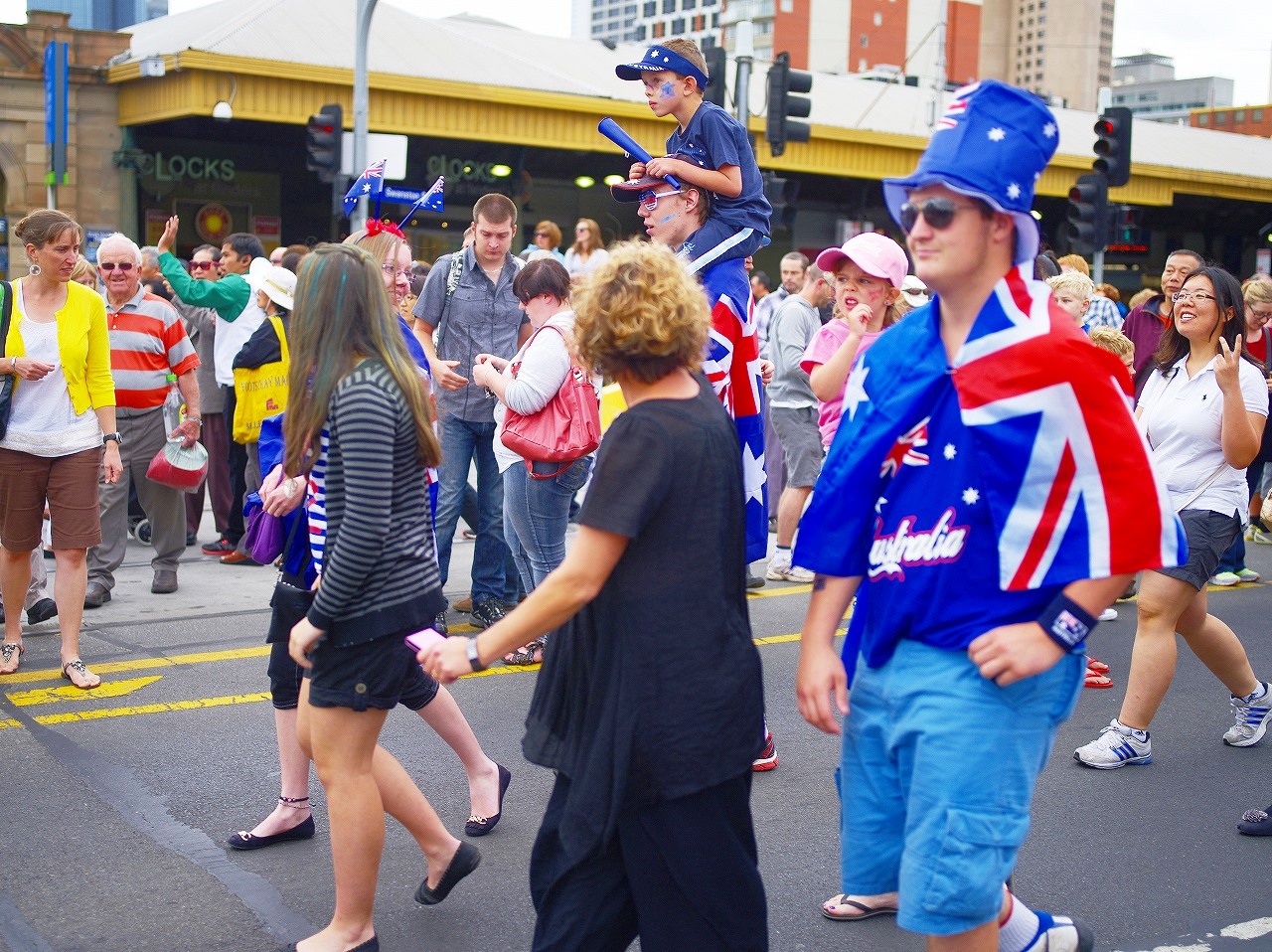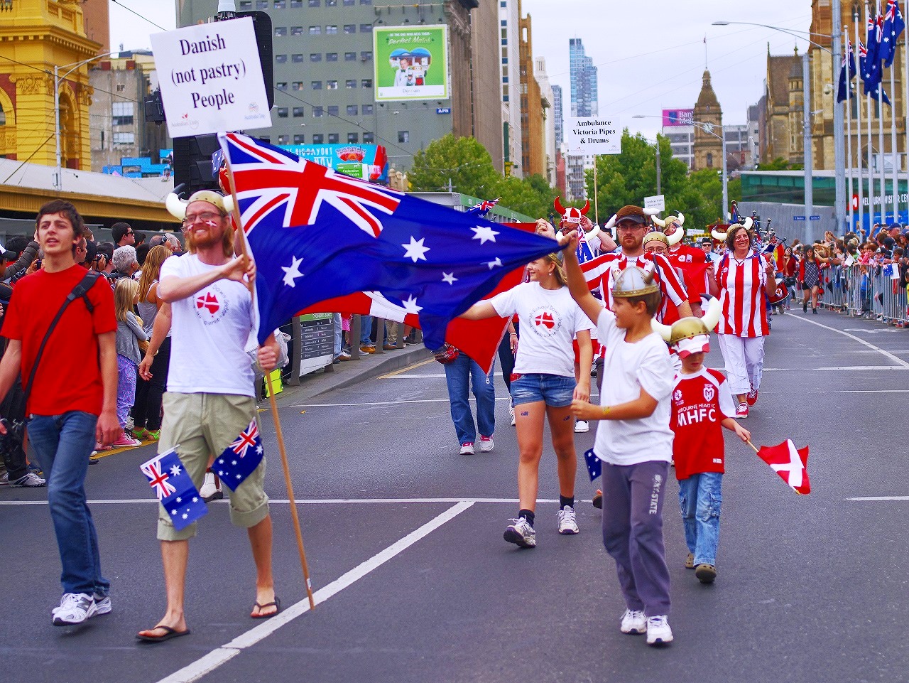 メルボルンのデンマーク人です。衣裳はこっていませんが、看板がシャレてます。「デーニッシュ(ペイストリーではない)の人々」と書いてあります。デーニッシュには「デンマークの」と「甘いパン」の2通りの意味がある。