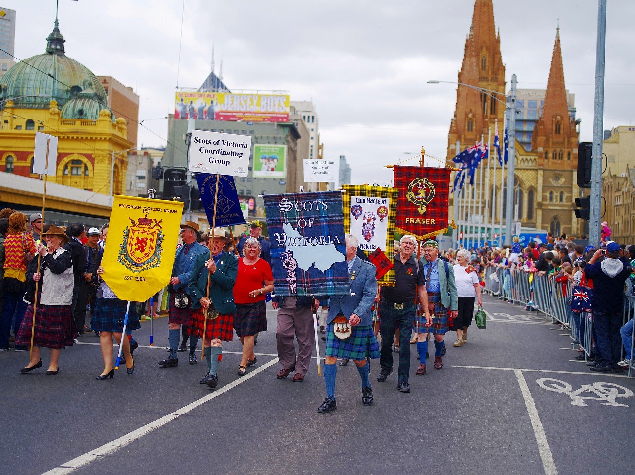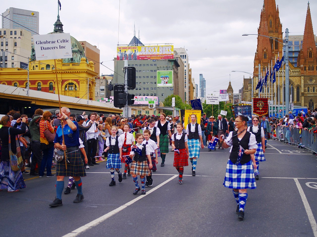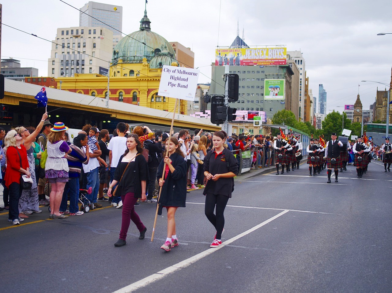 次は、3人で行進とは、チト、さびしい。と思って、看板をよく見ると、「メルボルン市・ハイランド・パイプ・バンド」とあるから、どうやら、後続のスコットランド音楽隊の看板娘が早く歩きすぎたようです。