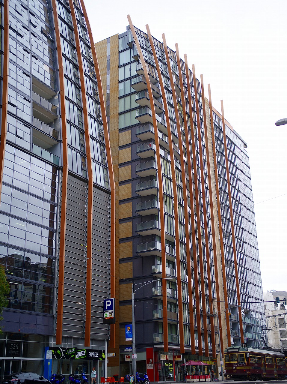 フリンダース通り(Flinders Street)の建物、斬新です。このデザイン・色・カーブ、独特です。どうして東京にはこういうのない(少ない)んでしょう。この建物、宿の前にある。