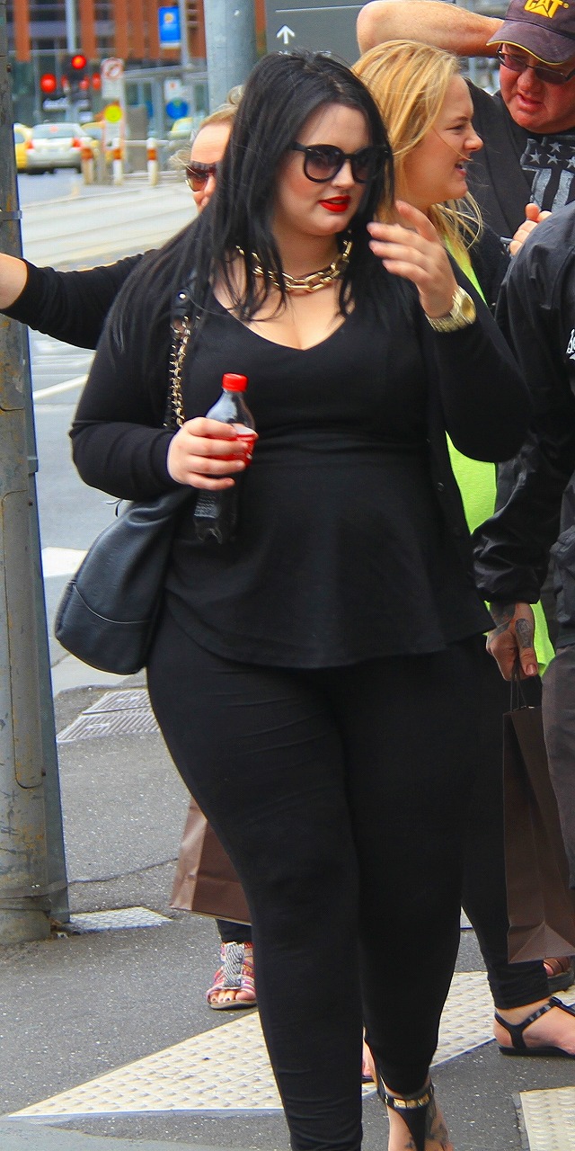 上のお嬢さんが白なら、黒でどうでしょう。髪は黒、眼鏡も黒、トップスも黒、飲み物が黒、バッグが黒、パンツが黒、サンダルも黒。唇が真っ赤で、ふくよかでセクシーです。