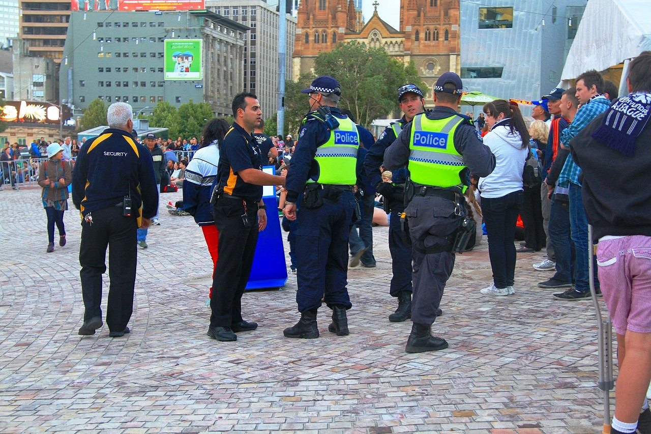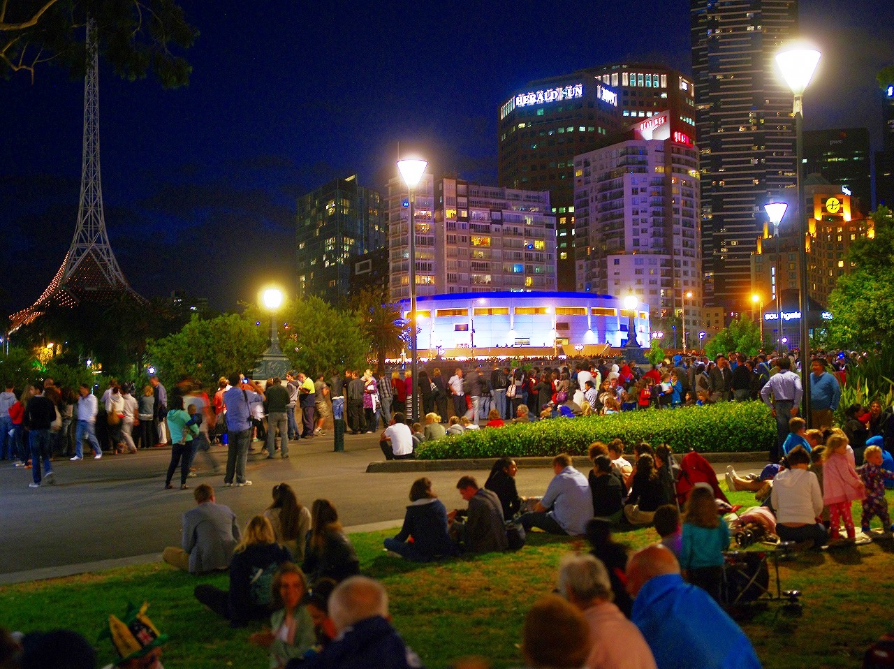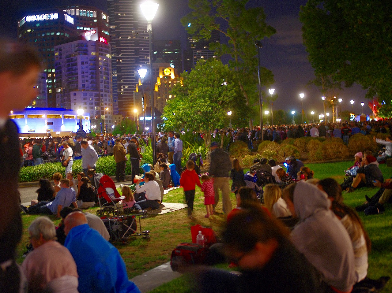 夕方、多くの人が、「フリンダース通り(Flinders Street)」駅の向かいの「フェデレーション・スクエア(Federation Square)」で、大スクリーンに写しだされる全豪オープンテニスを無料で観戦していた。試合途中の夜9時近い頃、まだ明るいが、2~3割の人が、ヤラ川(Yarra River)の方に移動した。何かあると感じて、マサケイも移動した。