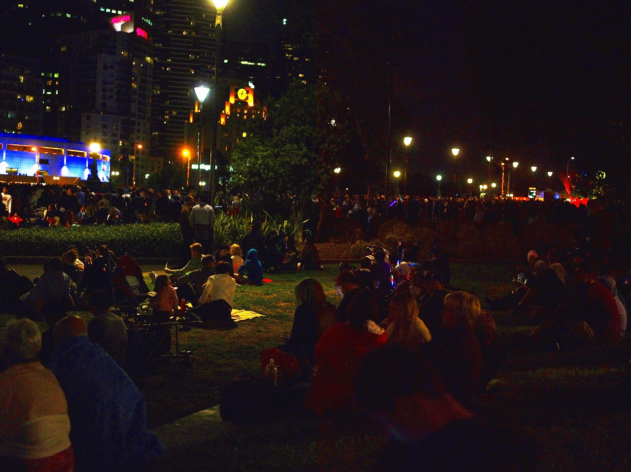 もうかなりの人が椅子や芝生に腰掛けていた。広いので座る場所はある。ここは「フェデレーション・スクエア(Federation Square)」から歩いて1分。ヤラ川(Yarra River)沿いの道の脇。正面の搭はメルボルン芸術センターの搭で(Arts Centre Melbourne)、右端の街灯の向こうの高いビルは、メルボルンで一番高いユーレカタワーである(Eureka Tower、地上92階、高さ300m。2007年5月にオープン)。