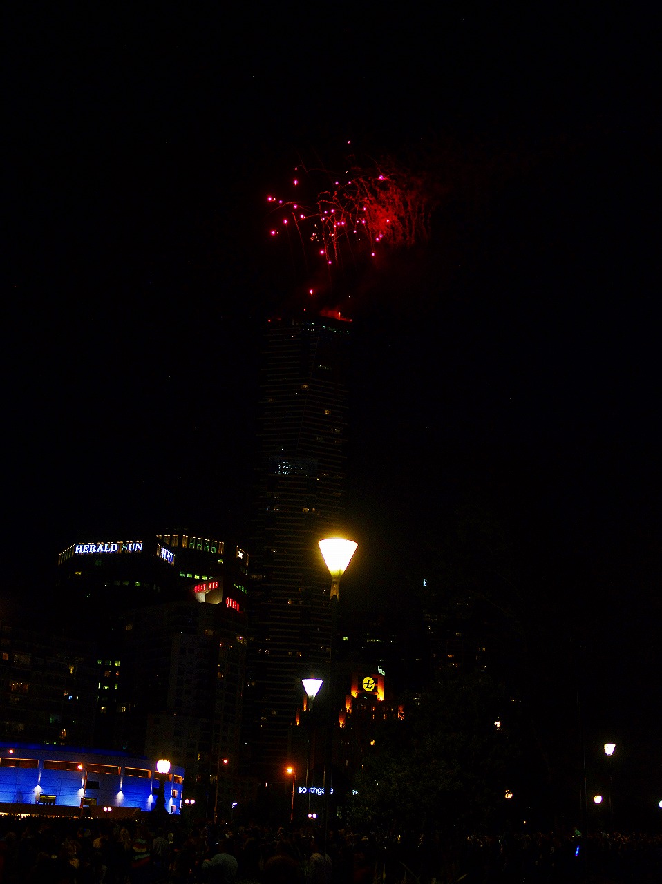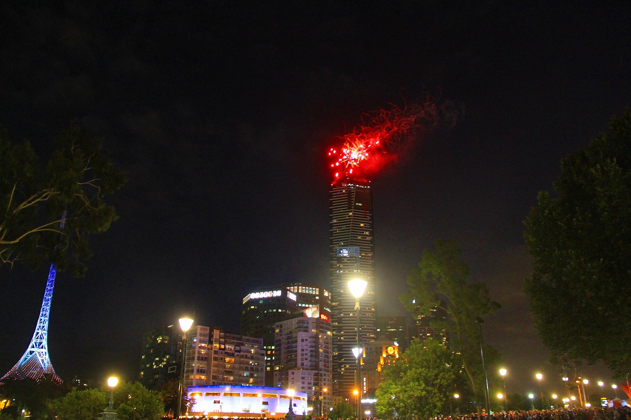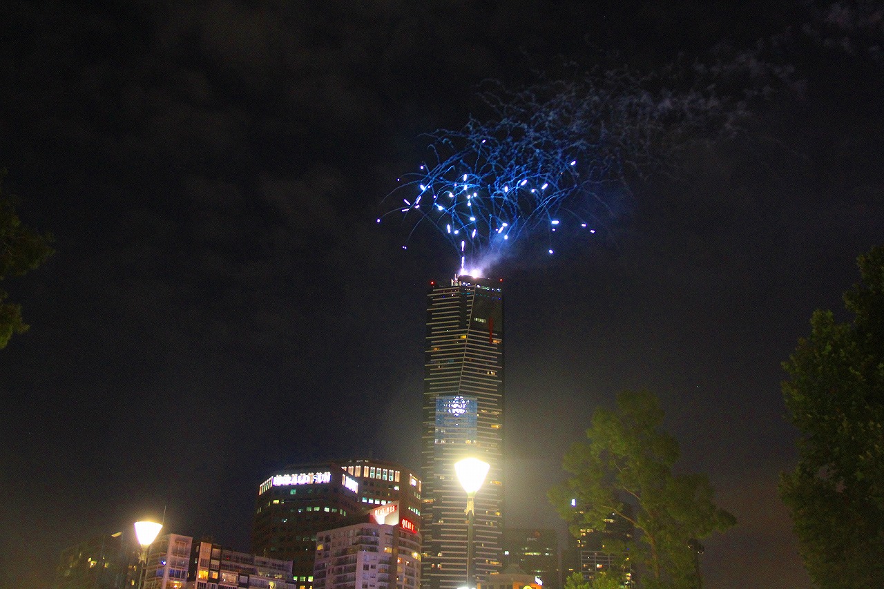 驚いたことに、メルボルンで一番高いユーレカタワーの屋上からも花火が上がった。日本もスカイツリーのから花火を打ち上げたらどうなんだろう。写真では街灯が明る過ぎる印象があるけど、実際は、もっと暗い。
