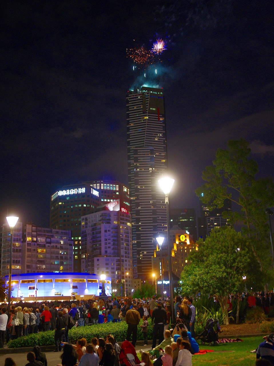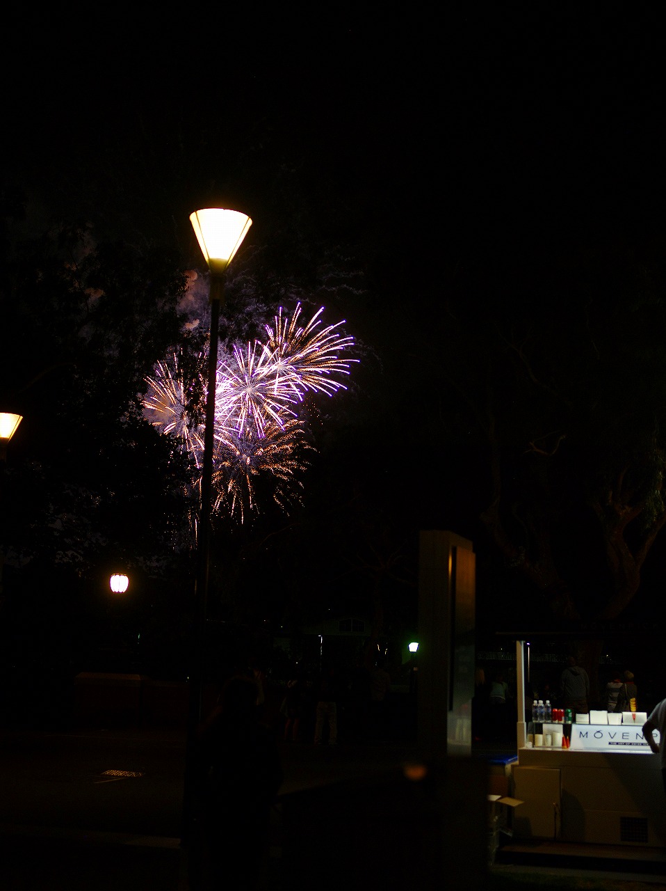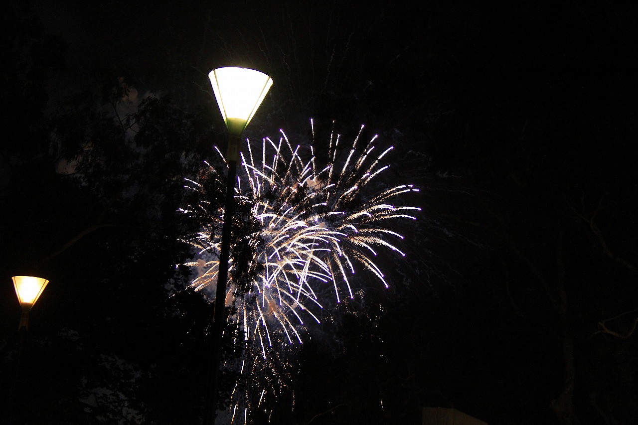 驚いたことに、メルボルンで一番高いユーレカタワーの屋上からも花火が上がった。日本もスカイツリーのから花火を打ち上げたらどうなんだろう。写真では街灯が明る過ぎる印象があるけど、実際は、もっと暗い。