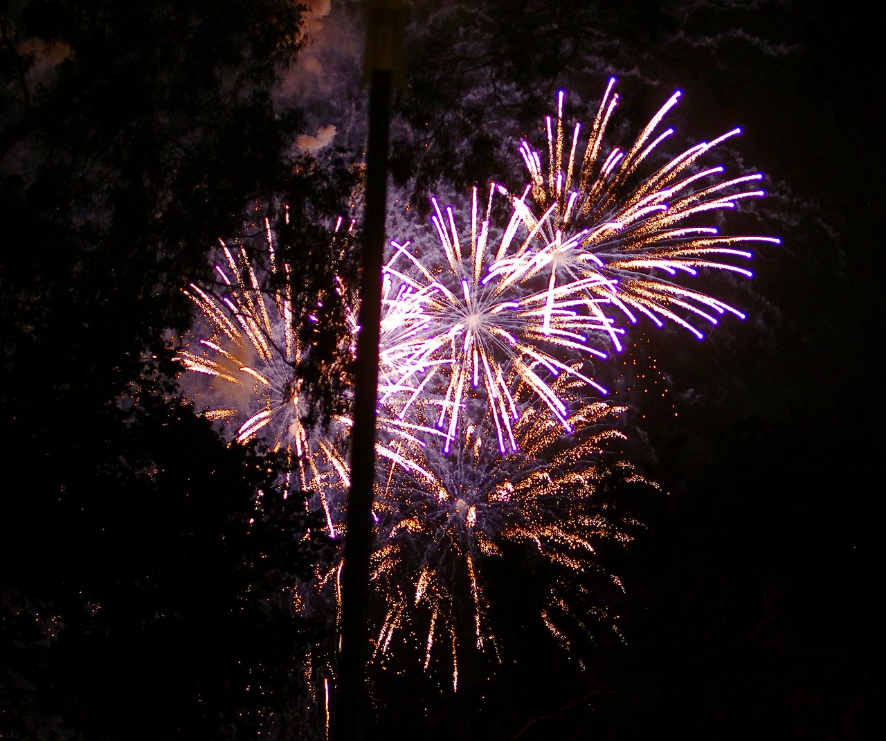 川向うの一か所から花火が上がった。。写真では街灯が明る過ぎる印象があるけど、人間の目はフィルター機能があるので、実際は、充分に花火を楽しめる。