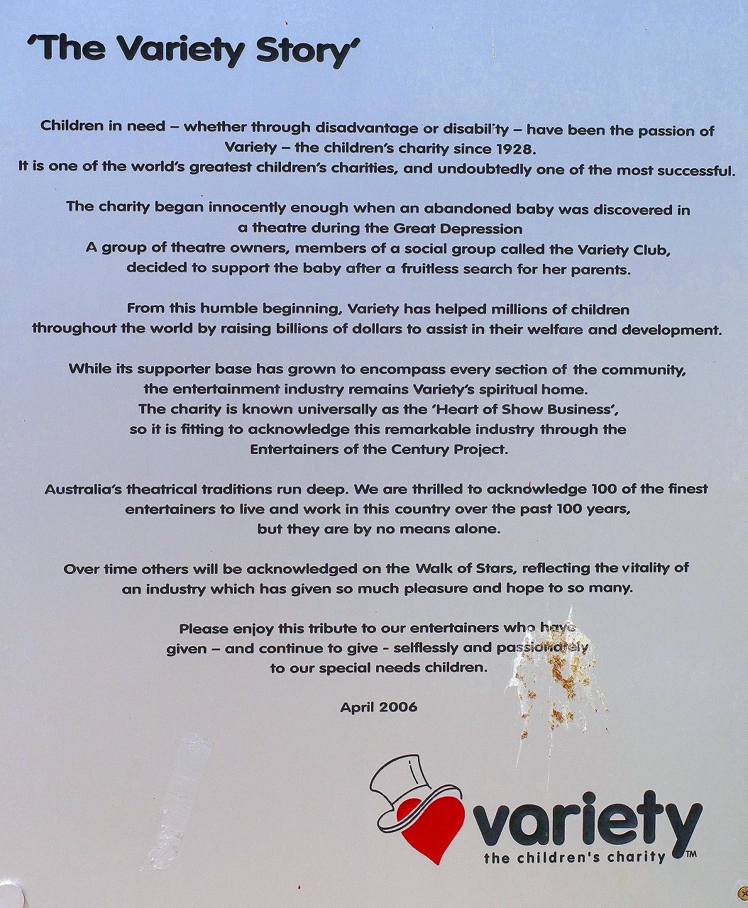 大恐慌の時代に、無邪気な子供たちが劇場捨てられていた。劇場の経営者たちと篤志家たちが子供たちを助ける会を作り「バラエティクラブ」と命名した。その後、「バラエティクラブ」は世界中の数百万人の子供たちを助けてきた。とある。