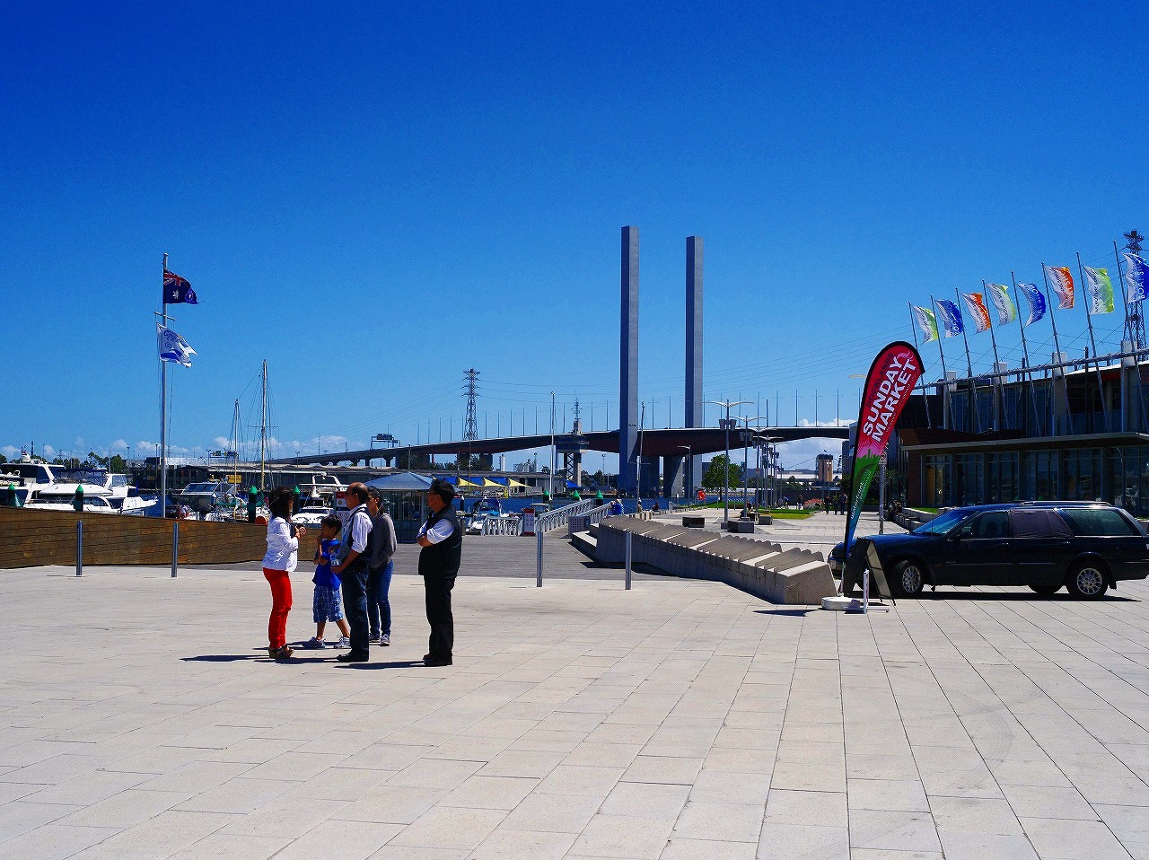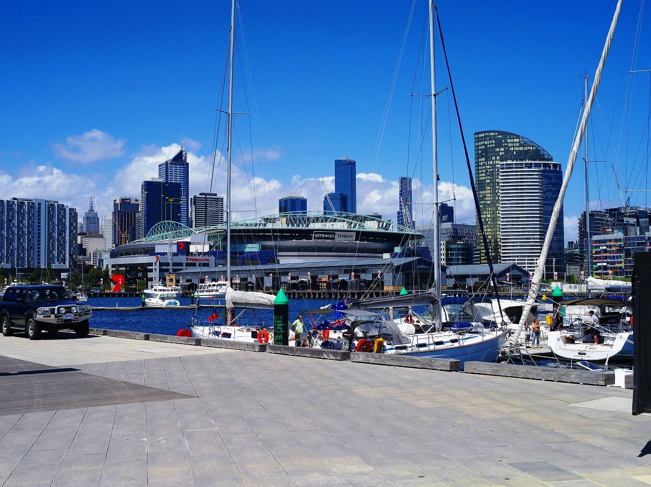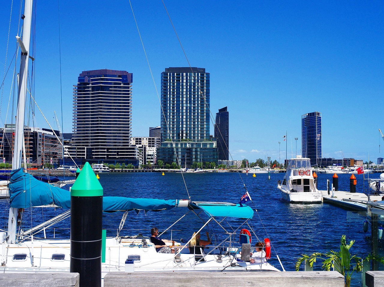 海にステキなヨットが係留され、岸壁の向こうはメルボルンの美しいビル群です。空は青く、太陽はまぶしい。